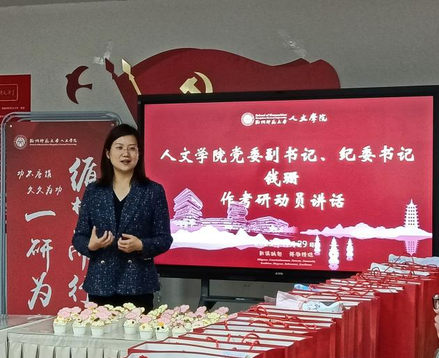 活动上,钱珊作考研动员讲话,为本届考研学子带来温暖寄语。钱珊强调,在备战考研的最后一个阶段,阳光心态和身体健康都十分重要。希望大家能够坚定信念,在这个冲刺阶段拥有良好的心态和健康的体魄,从容地迎接接下来的这一门属于人生的挑战,并选择坚持到最后一刻,为考研画上一个圆满的句号。